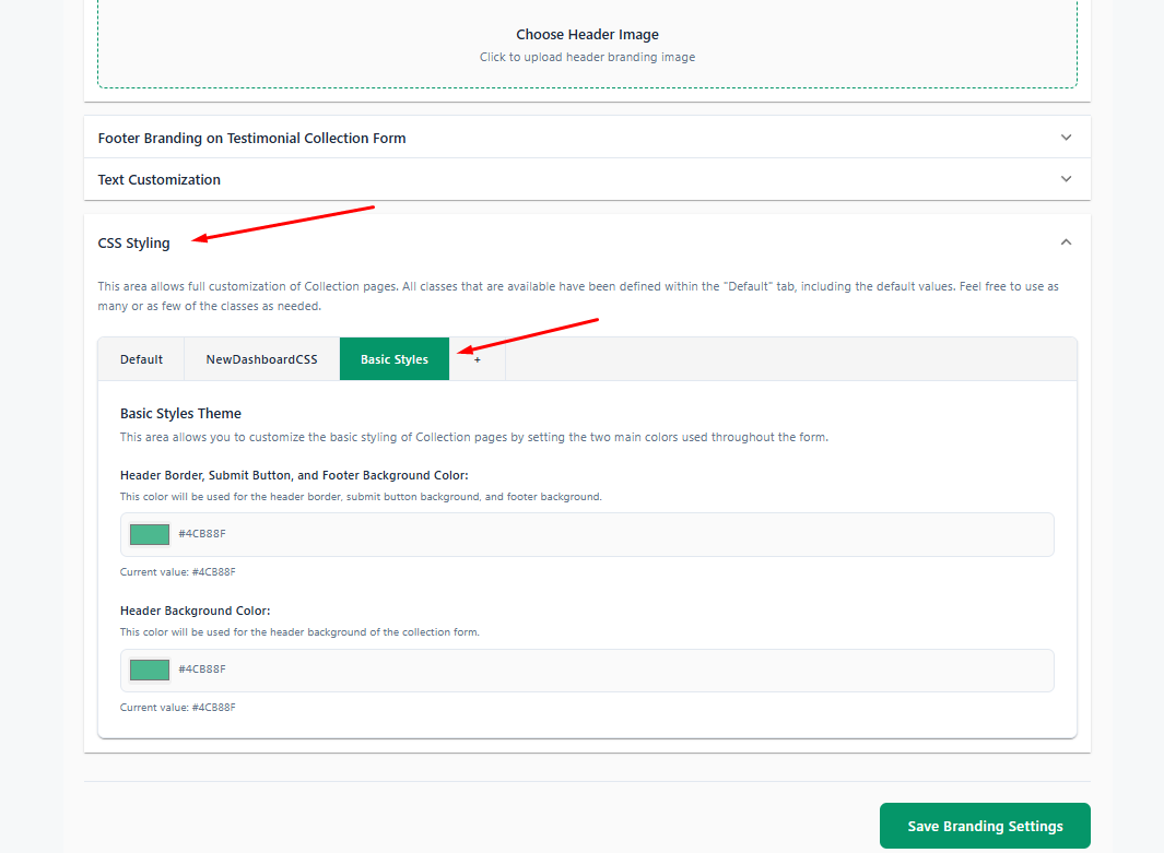 To customize your colors, click on CSS Styling, then select the Basic Styles section.