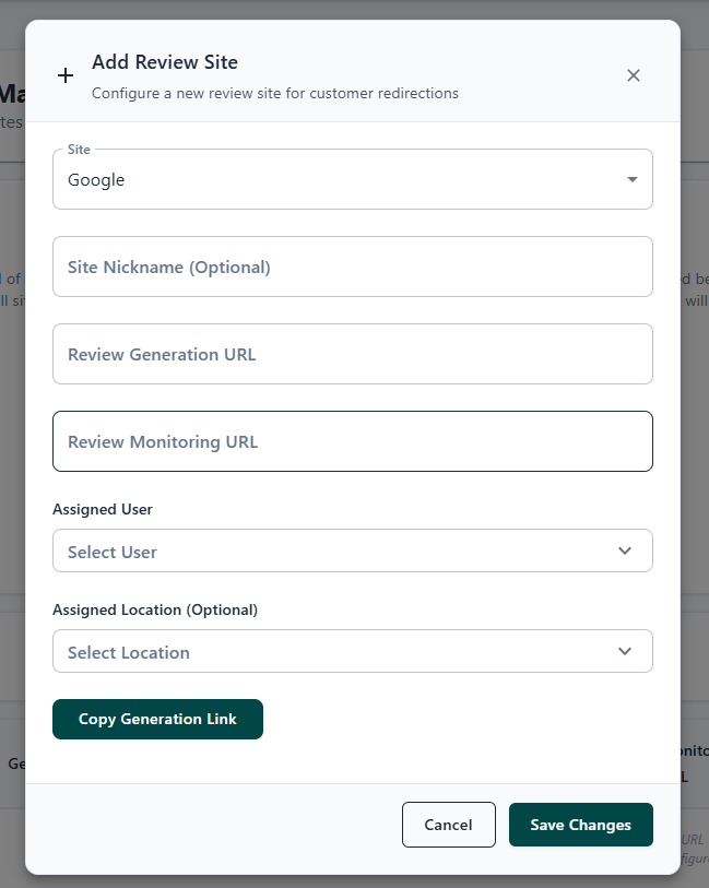 On the Review Generation page, below settings, click on "+Add Site"