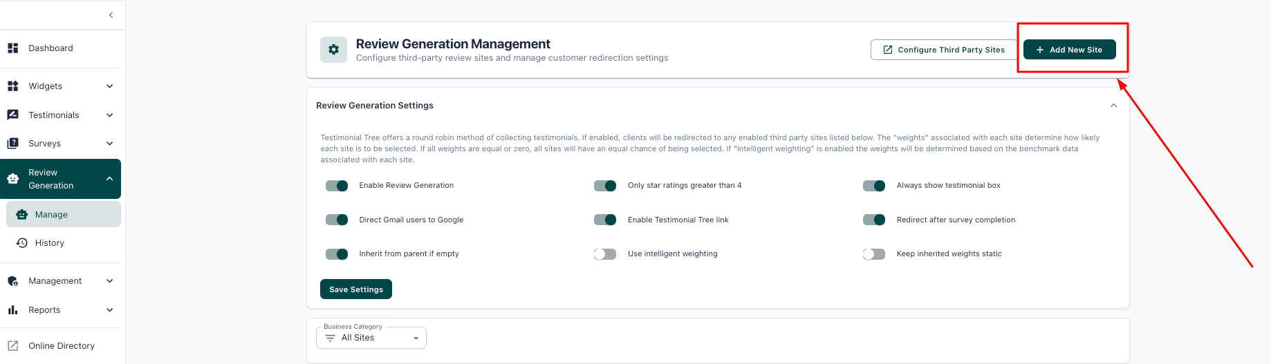 Adding, Managing, and Deleting Third-Party Sites (Review Generation) Testimonial Tree offers the ability to send customers to third-party sites' "Leave a Review" page to leave you a testimonial and a high-star rating. For our purposes, third party ...