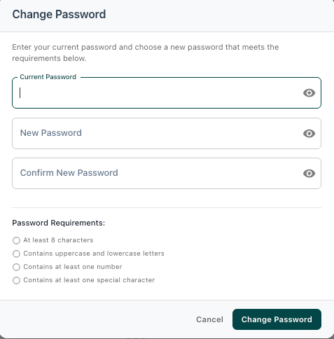 Fill in the form with your current and new password, then click Change Password to confirm.