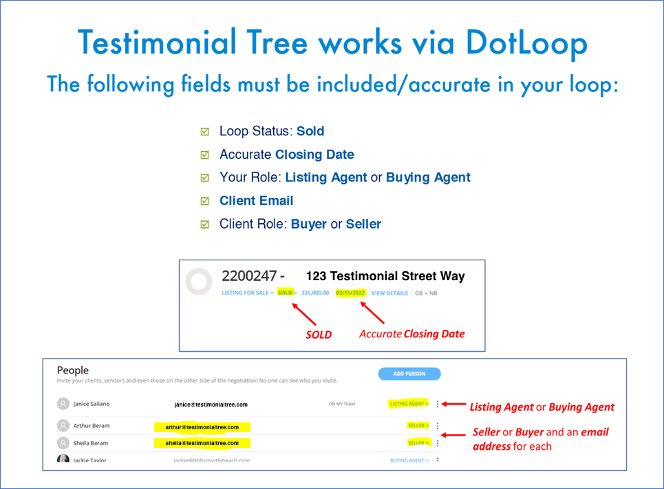 - Agent Email Address in Dotloop Must Match Email Address Associated with the Agent's Account Profile within Testimonial Tree