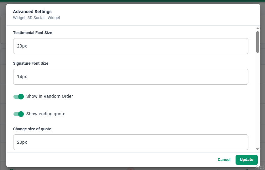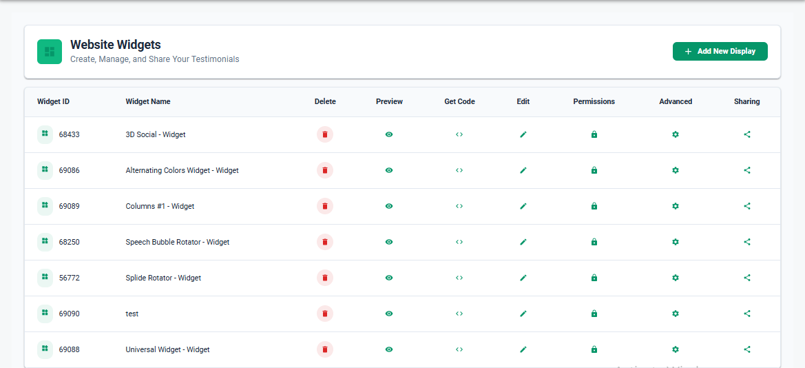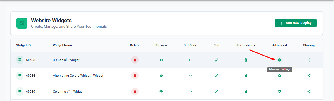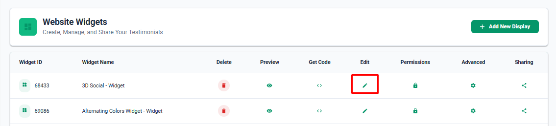 There are two options for editing widgets. Selecting the Edit button will allow you to adjust the widget type, select and change which testimonials are displaying through that widget, or change the name of the widget. The Advanced button will allow you to customize the display settings for that widget. For instance, you're able to adjust things like star color, how many testimonials display at once, display order, auto rotate, background color, testimonial font color, etc.