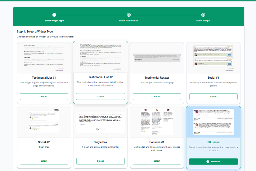 Step 2: This will launch the Widget Wizard. Your current widget type will be highlighted in green. If you are changing the widget type, select the new type you'd like to use. If you're pleased with your current widget type, find your widget (which will be in green) and select Choose and Continue.