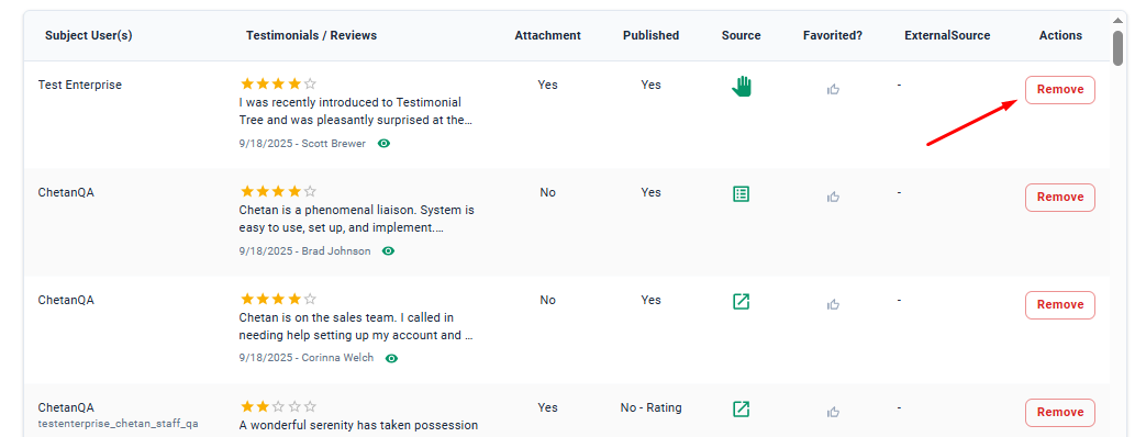 Step 3: The next step allows you to select which testimonials you'd like to display on the widget. Those currently being displayed will have a Remove action button, and those not currently being displayed will have an Add action button. Make any adjustments to this page as needed, then click Continue at the bottom of the page