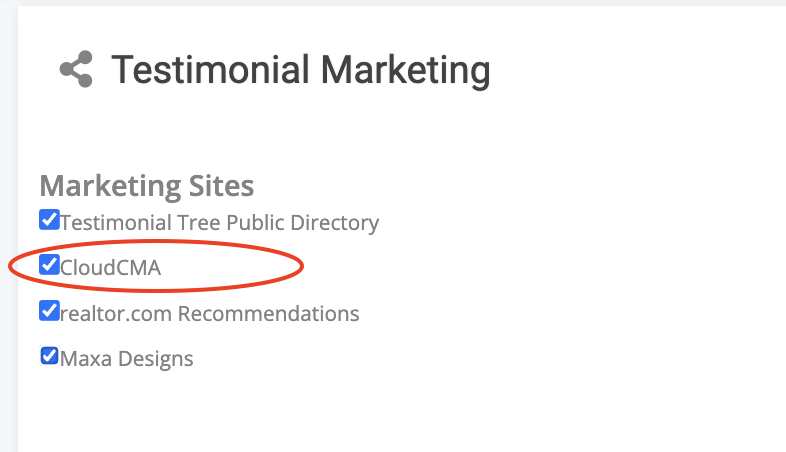 Step 4: Under Marking Sites make sure the box next to CloudCMA is checked. If the box is not checked, select it and then click Save at the bottom of the page. Your testimonial is now synced to CloudCMA!