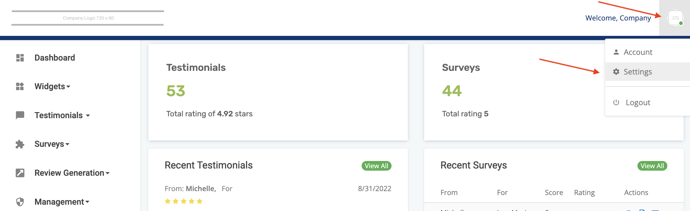 Step 1: From your dashboard click on your company image or wheel icon on the upper right. Then click Settings.