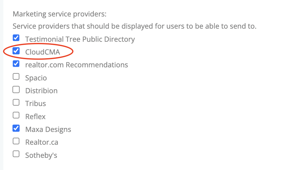 Step 2: On the User Permissions tab, scroll down to Marketing service providers and check the box next to CloudCMA and then click Save at the bottom of the page