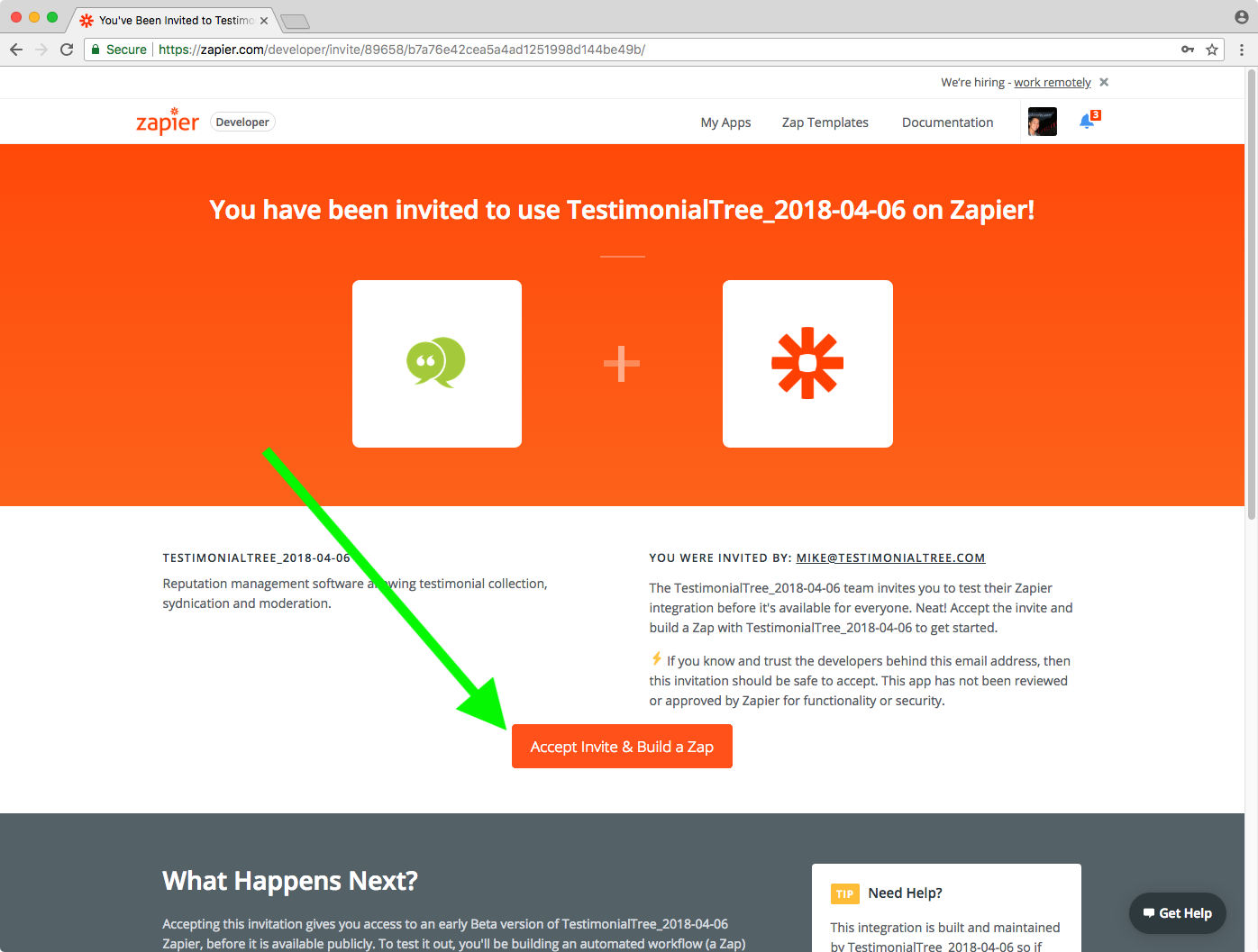 Step 3: Click the "Accept Invite & Build a Zap" button