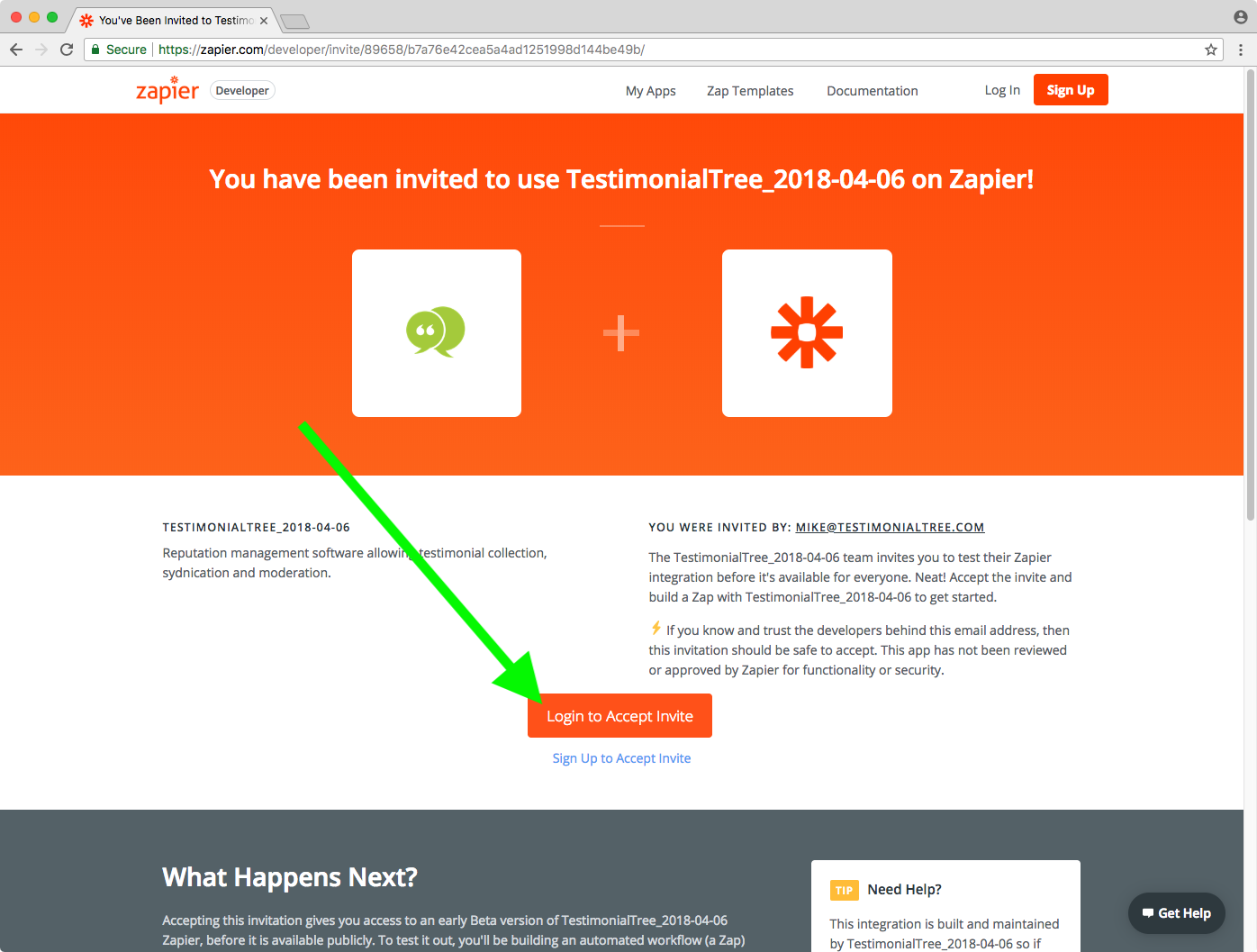 Step 2: Click on the "Login to Accept Invite" button on the Zapier page