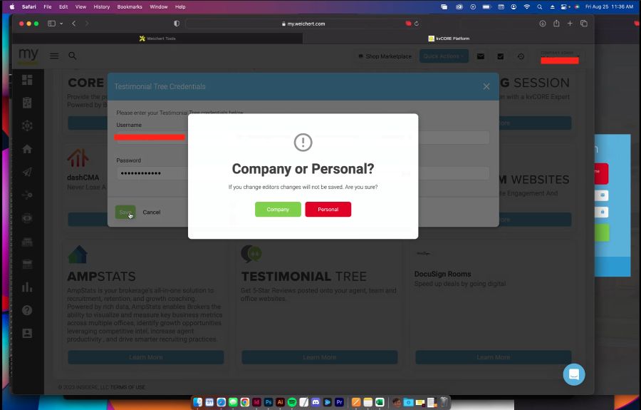 Username and password > select company or personal to complete the connectionStep 4: Content will appear in your Web & IDX section of your kvCORE dashboard.