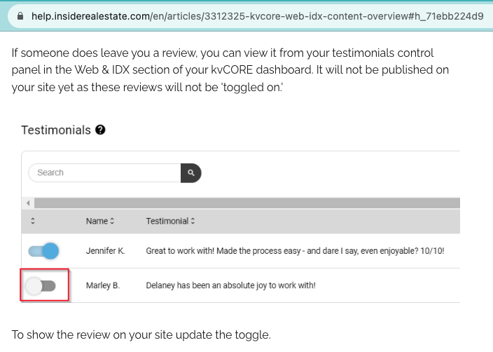 Control testimonials toggle on/off in your web & IDX section of kvCORE dashboardStep-by-step included in the kvCORE support article below.