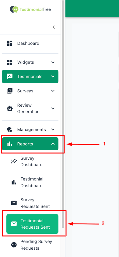 Step 1: From the Dashboard, click on Reports in the Navigation Bar and then Testimonial Requests Sent