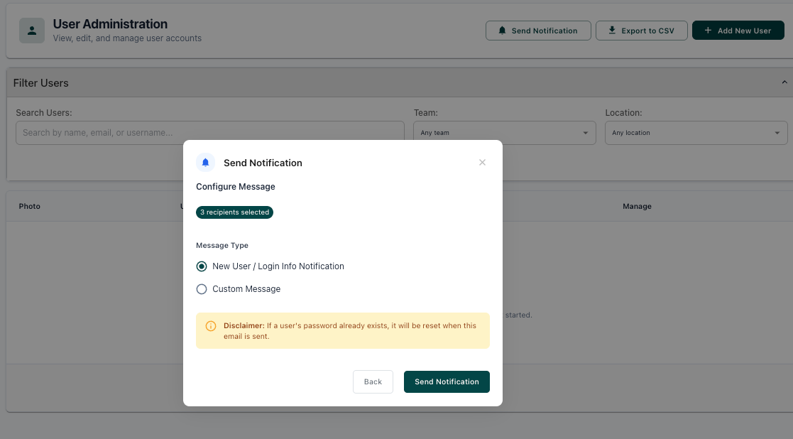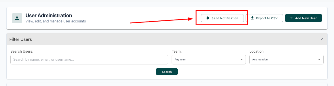 2. Select 'Send Notification' from the bar at the top of the User Administration page: