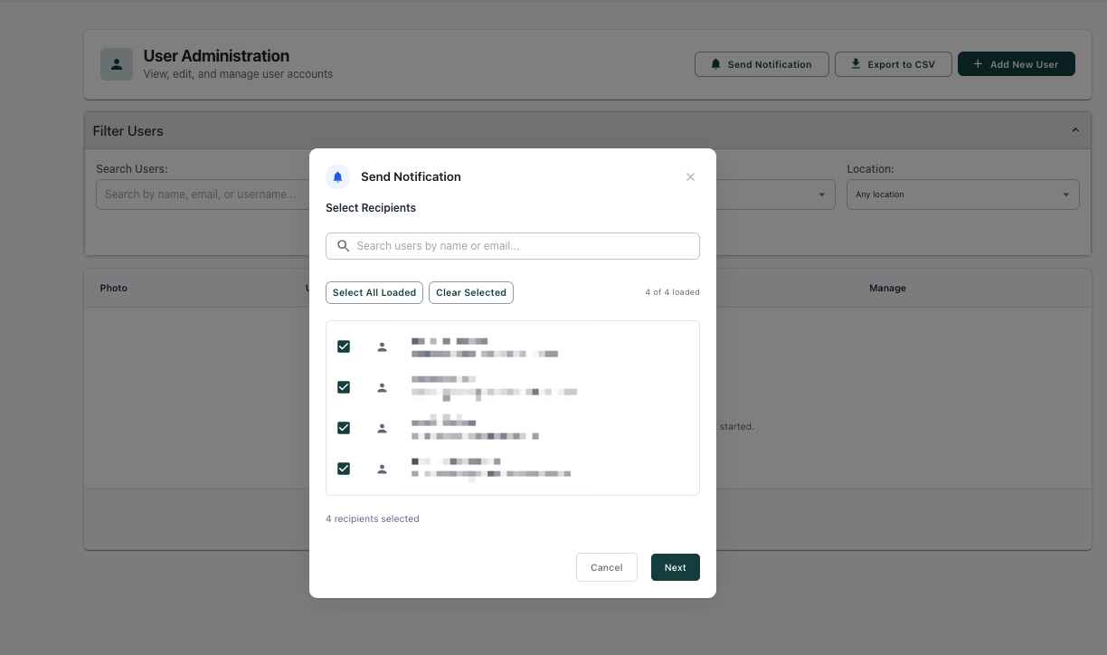 3. You can either use the 'Select All Loaded' or individually select the users you want to send an email to. Then scroll down and click the green 'Next' button: