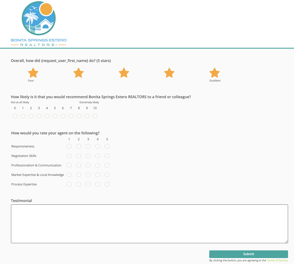 Testimonial Tree is excited to be powering your awards, recognition, and reviews platform. You are now able to send feedback/surveys to your customers and have testimonials syndicate to REALTOR.com and your BER profile (coming soon).