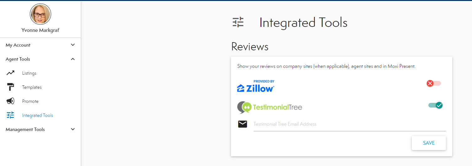 Step 3: Navigate to your agent profile by clicking your picture in the upper right corner and selecting "My Account". The Testimonial Tree toggle is located in the “Agent Tools” section. Select Integrated Tools from the menu and enter your info.