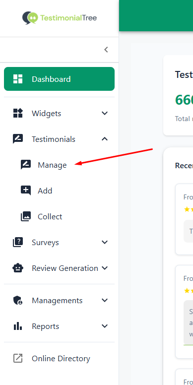 From the Dashboard, click on Testimonials in the left-hand navigation bar, then select Manage Testimonials.