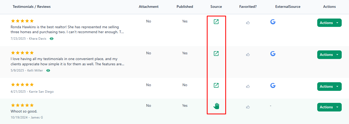 The Manage Testimonials page will open. Under the Source column, you will see one of the following four icons, each showing how the testimonial was submitted: